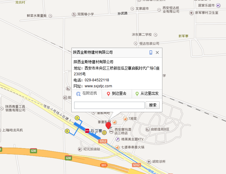 陜西金斯特建材有限公司 地址:陜西省西安市未央?yún)^(qū)三橋新街后衛(wèi)寨啟航時(shí)代廣場C座2305號 地鐵路線:乘坐地鐵1號線到后衛(wèi)寨站下車走D出口 電話:029-84522118 網(wǎng)址:www.sxjstjc.com 郵箱:2923417934@qq.com 聯(lián)系人:李女士 181 8243 0805